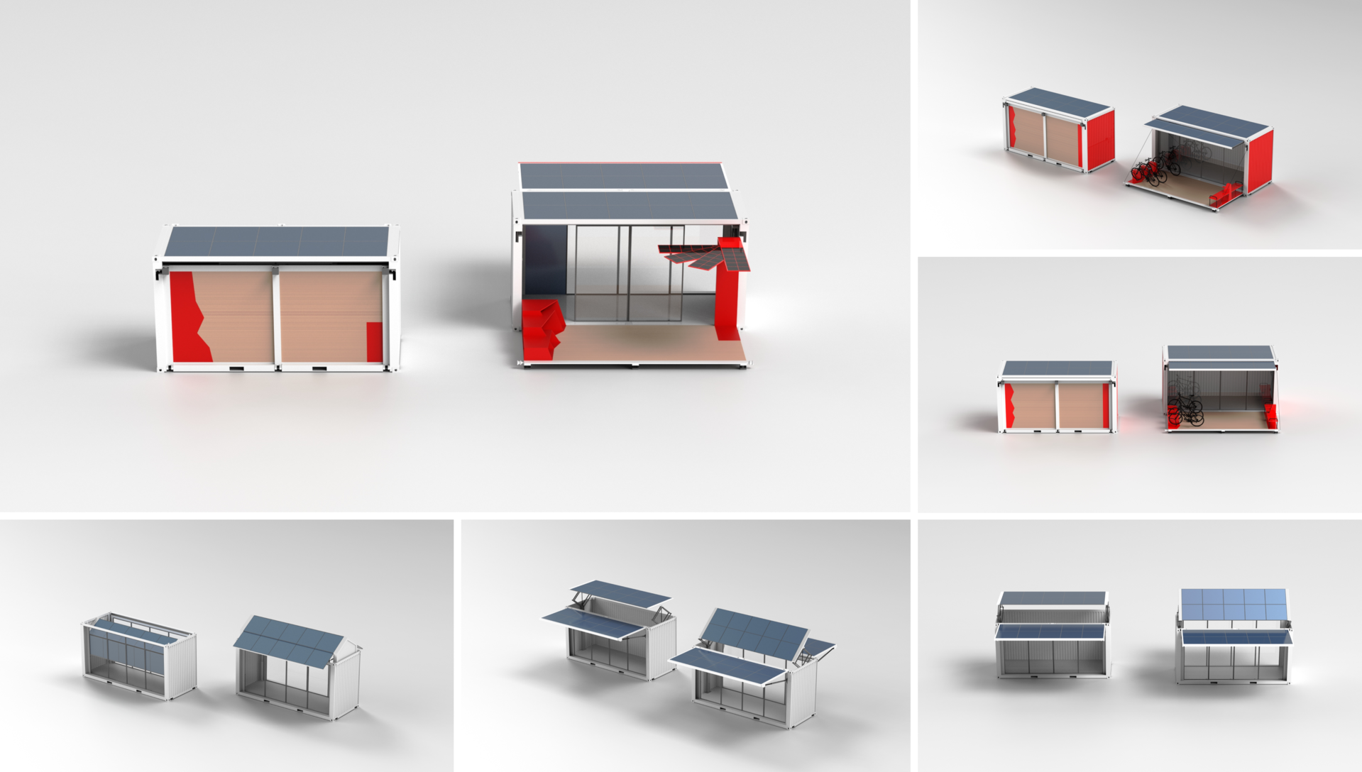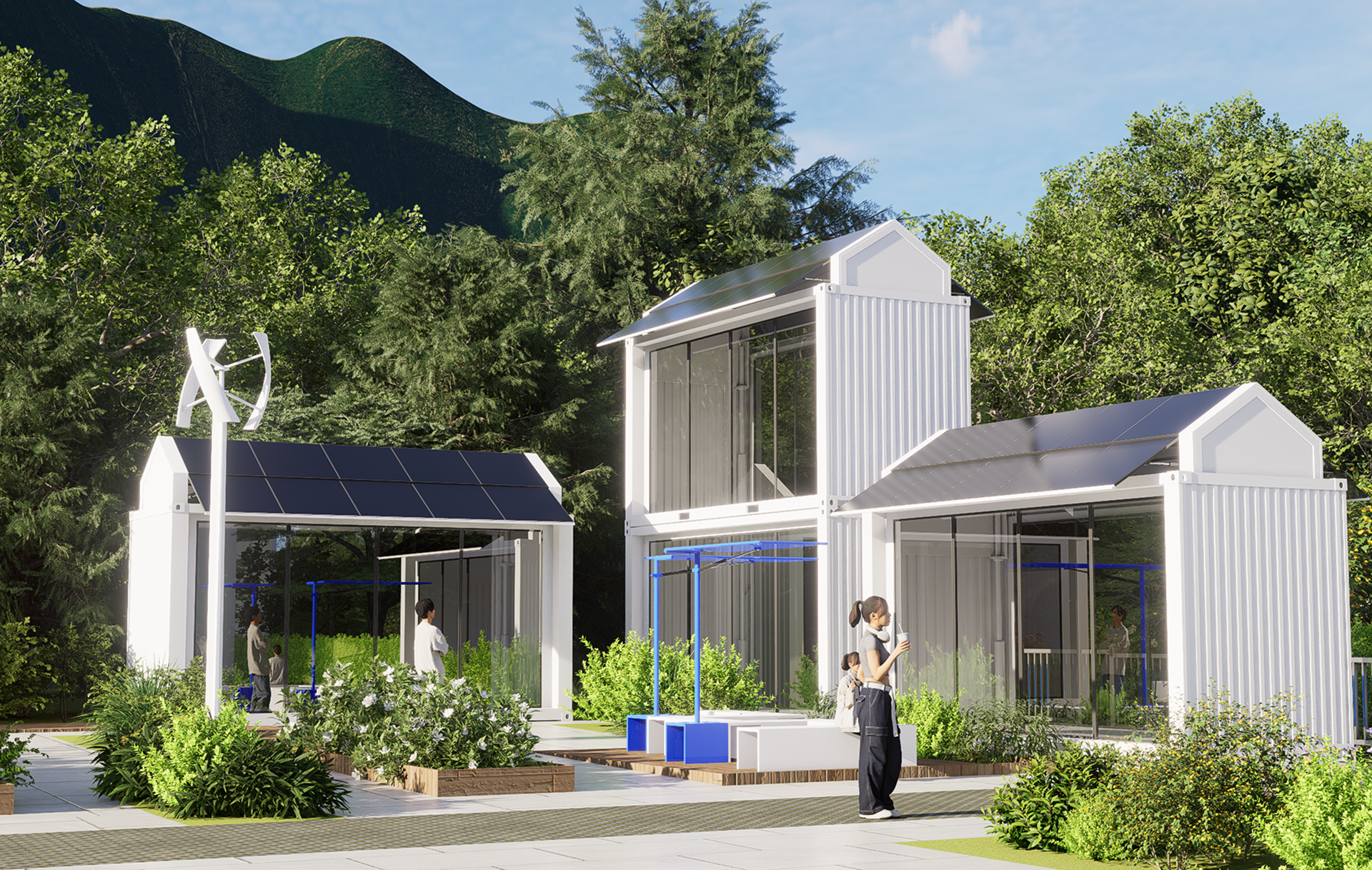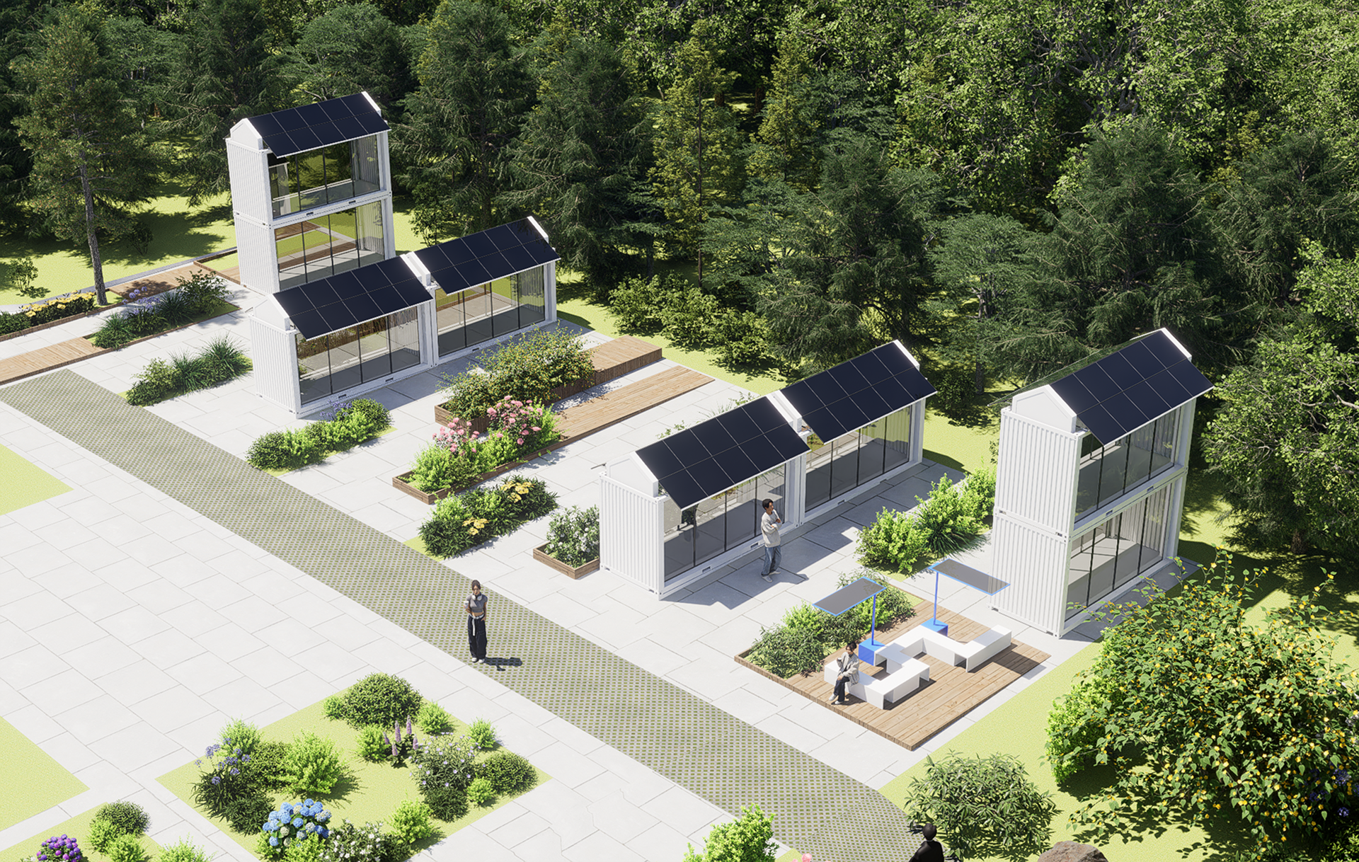 Solar Container๋ ์์ฑํ BIPV(Building Integrated Photovoltaic) ํจ๋์ ์ ์ฉํ ์ด๋ํ·๊ฐ๋ณํ ์คํธ๋ฆฌํธ ํผ๋์ฒ ๋์์ธ์ด๋ค.โจ